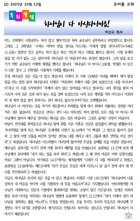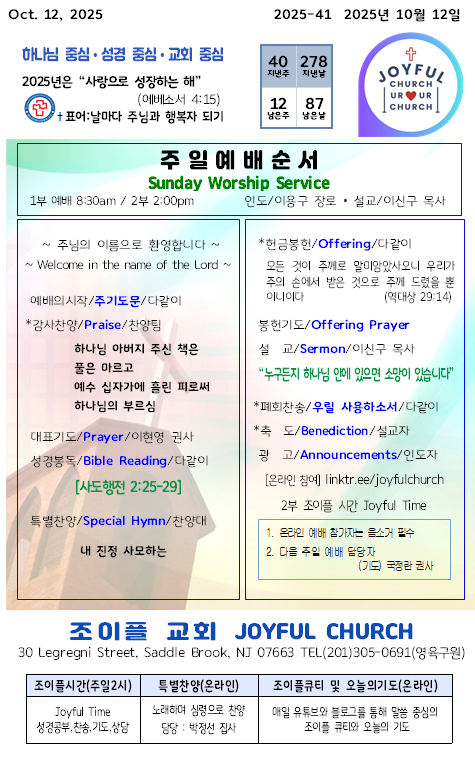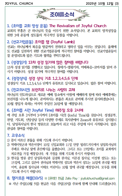 * 2025년 10월 12일 조이플교회 온라인 주보입니다.