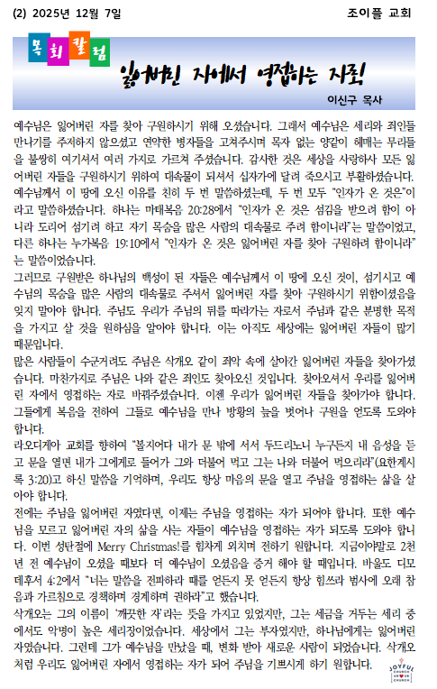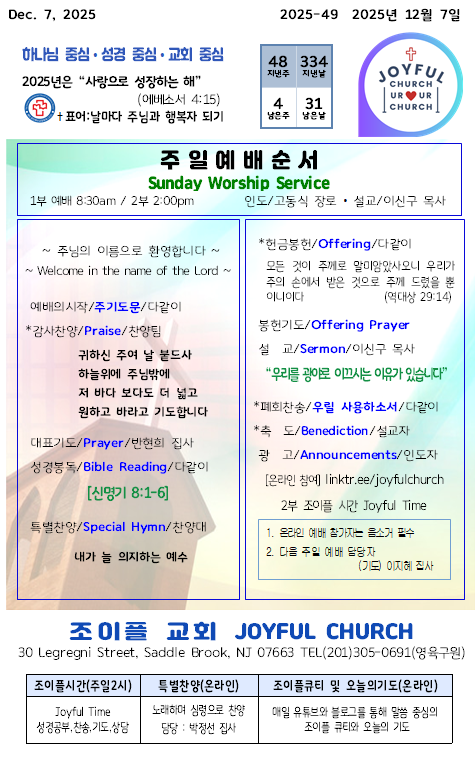 * 2025년 12월 7일 조이플교회 온라인 주보입니다.