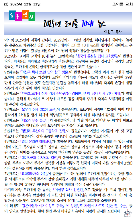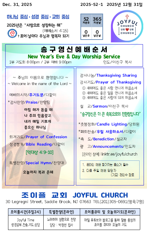 * 2025년 12월 31일 조이플 교회 송구영신예배 온라인 주보입니다.