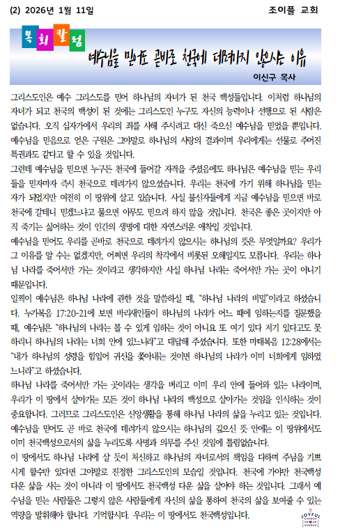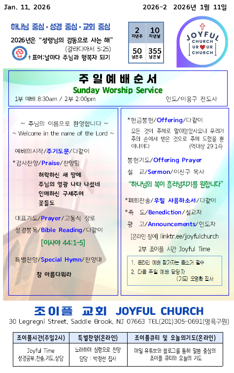* 2026년 1월 11일 조이플 교회 온라인 주보입니다.