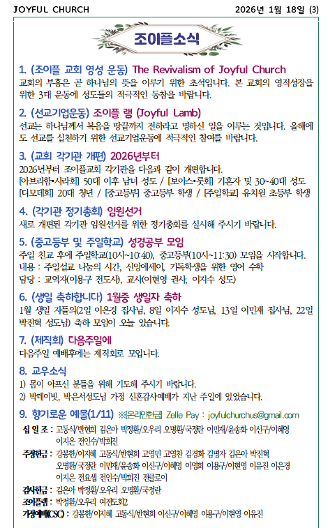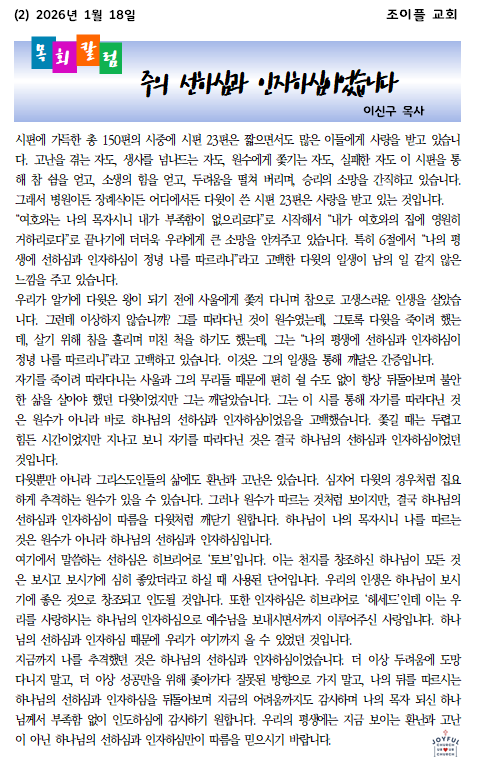 * 2026년 1월 18일 조이플 교회 온라인 주보입니다.